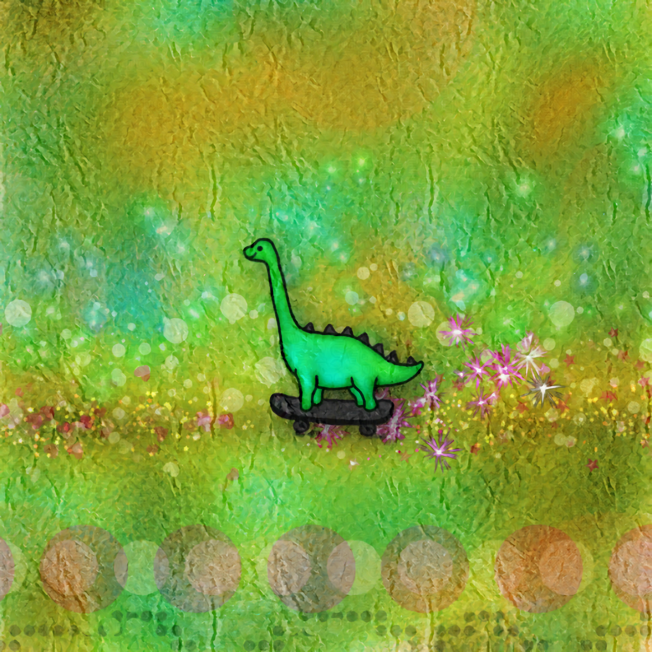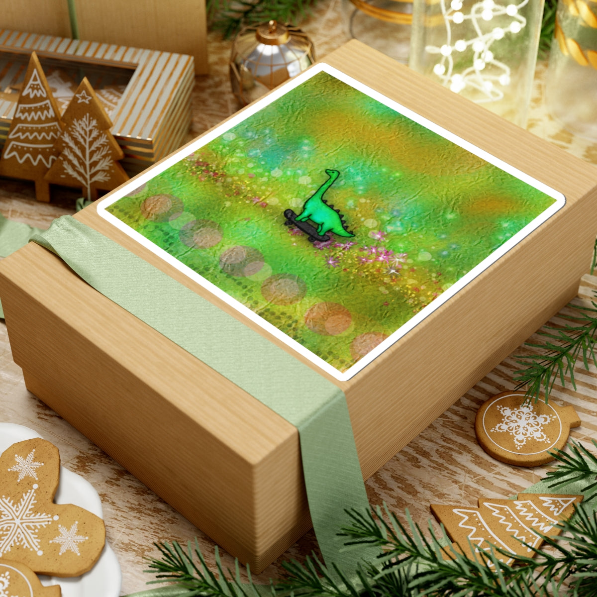 A playful, glossy kiss-cut sticker that brings a burst of nostalgic charm to your everyday gear. A small, green brontosaurus rides a skateboard across a dreamy, watercolor-like field of sparkles and soft bokeh — colors pop with eco-solvent inks on a scratch-resistant glossy surface. Lightweight and quick to apply, it adheres smoothly to flat surfaces like laptops, journals, water-resistant cases, and window panes (note: not waterproof). Choose from white or transparent backing and four sizes to match your layout. Handpicked for adult collectors and anyone who loves whimsical, retro-inspired art, this sticker adds a touch of joy to workspaces, sketchbooks, and cozy home corners.