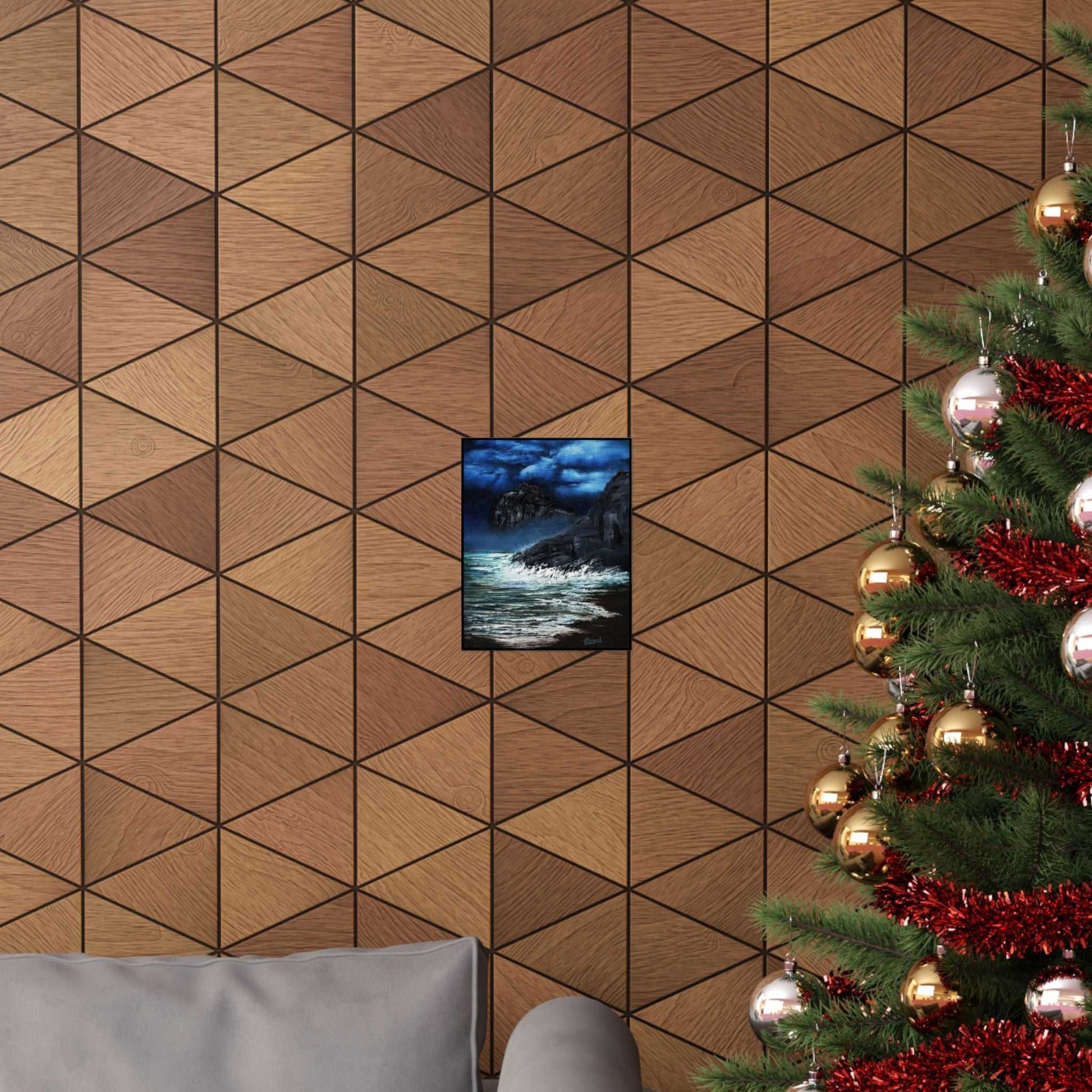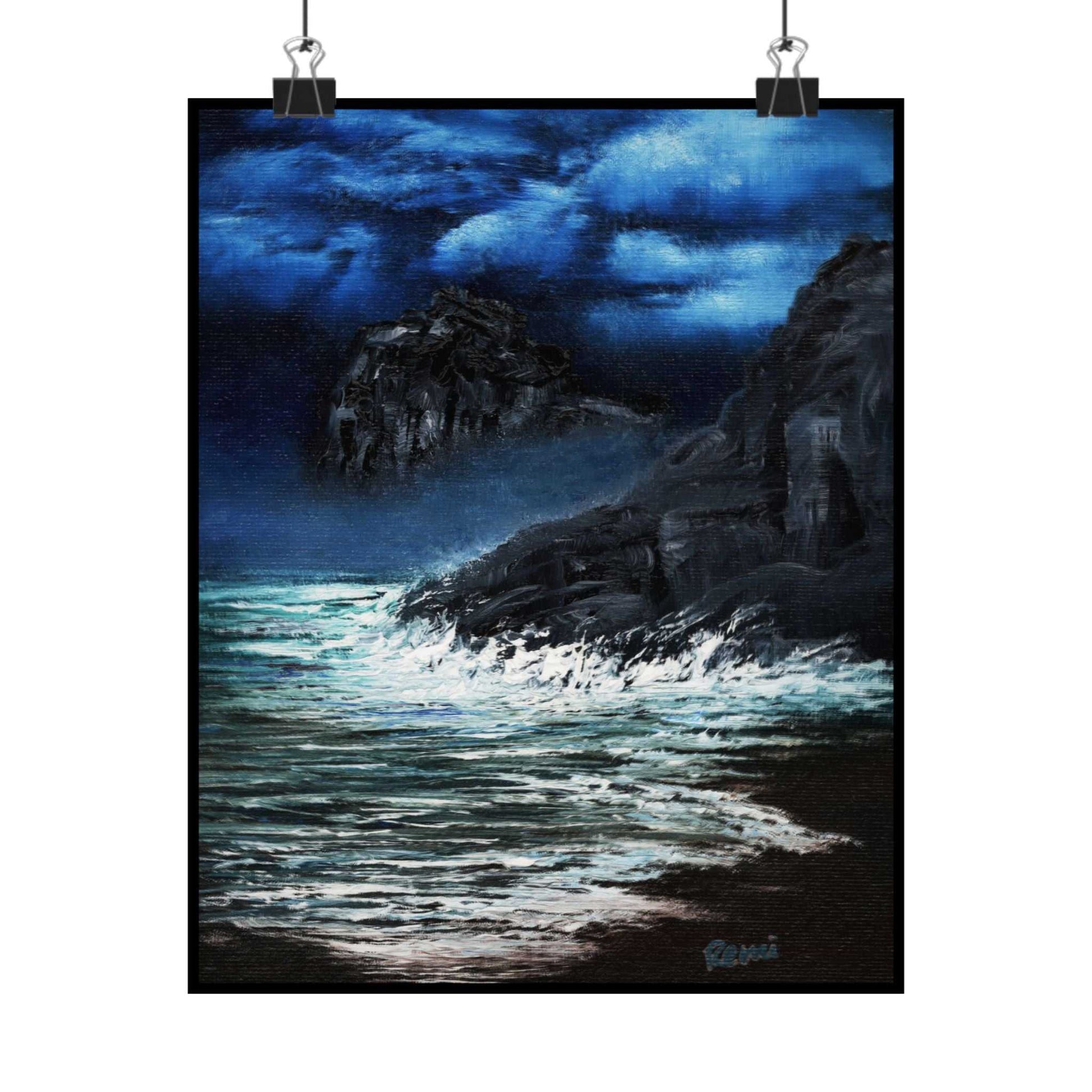 Deep indigo skies meet crashing surf in this matte vertical poster that brings a stormy coastal moment into your space. The scene holds salt-scented air, jagged cliffs, and frothing waves captured in rich, archival Giclée inks that keep those moody blues vivid over time. Hung above a reading nook or in a studio, it invites quiet reflection and the kind of restless calm that belongs to night beaches and late walks by the sea.