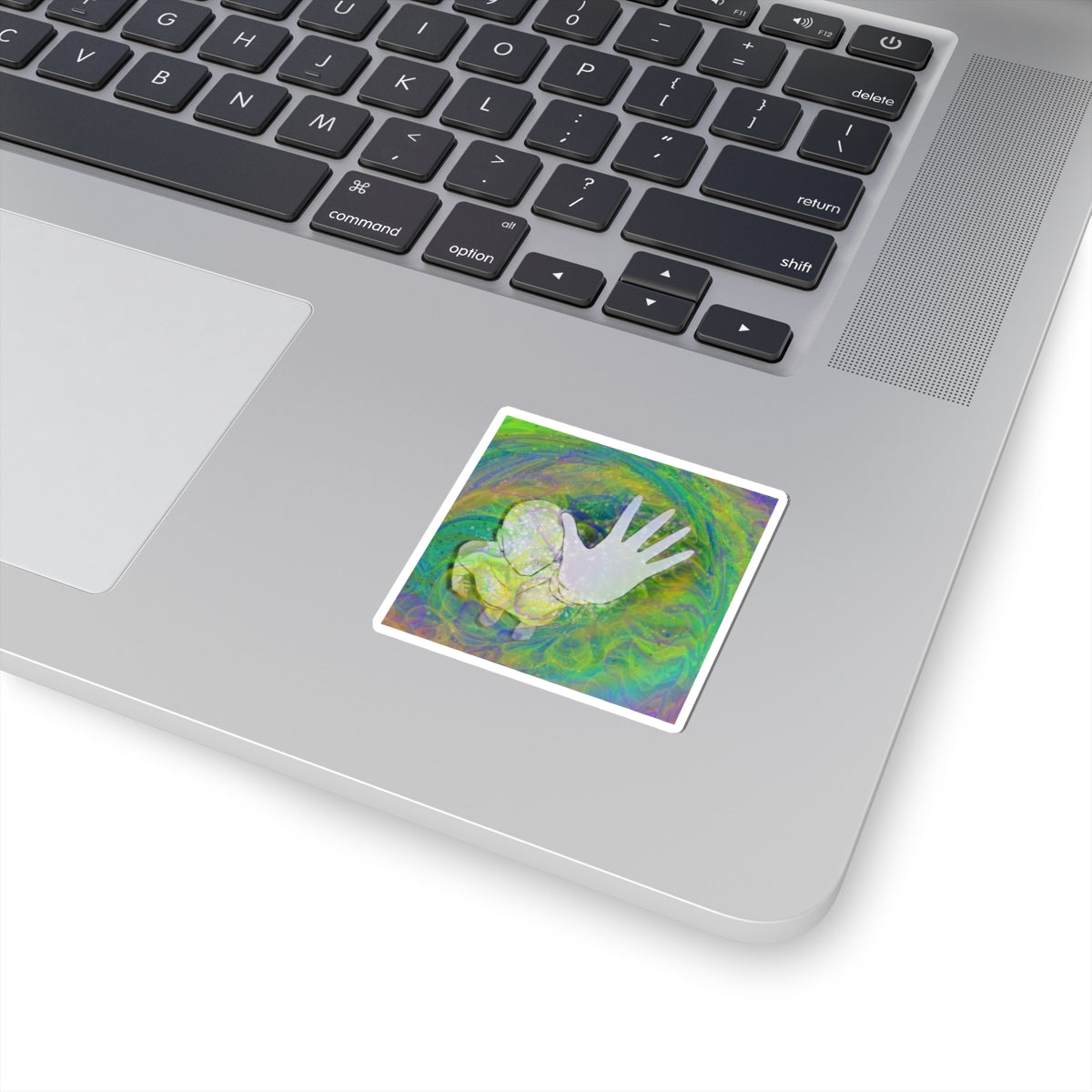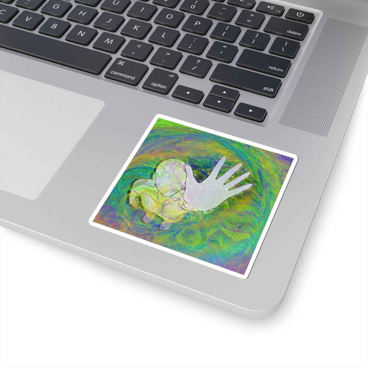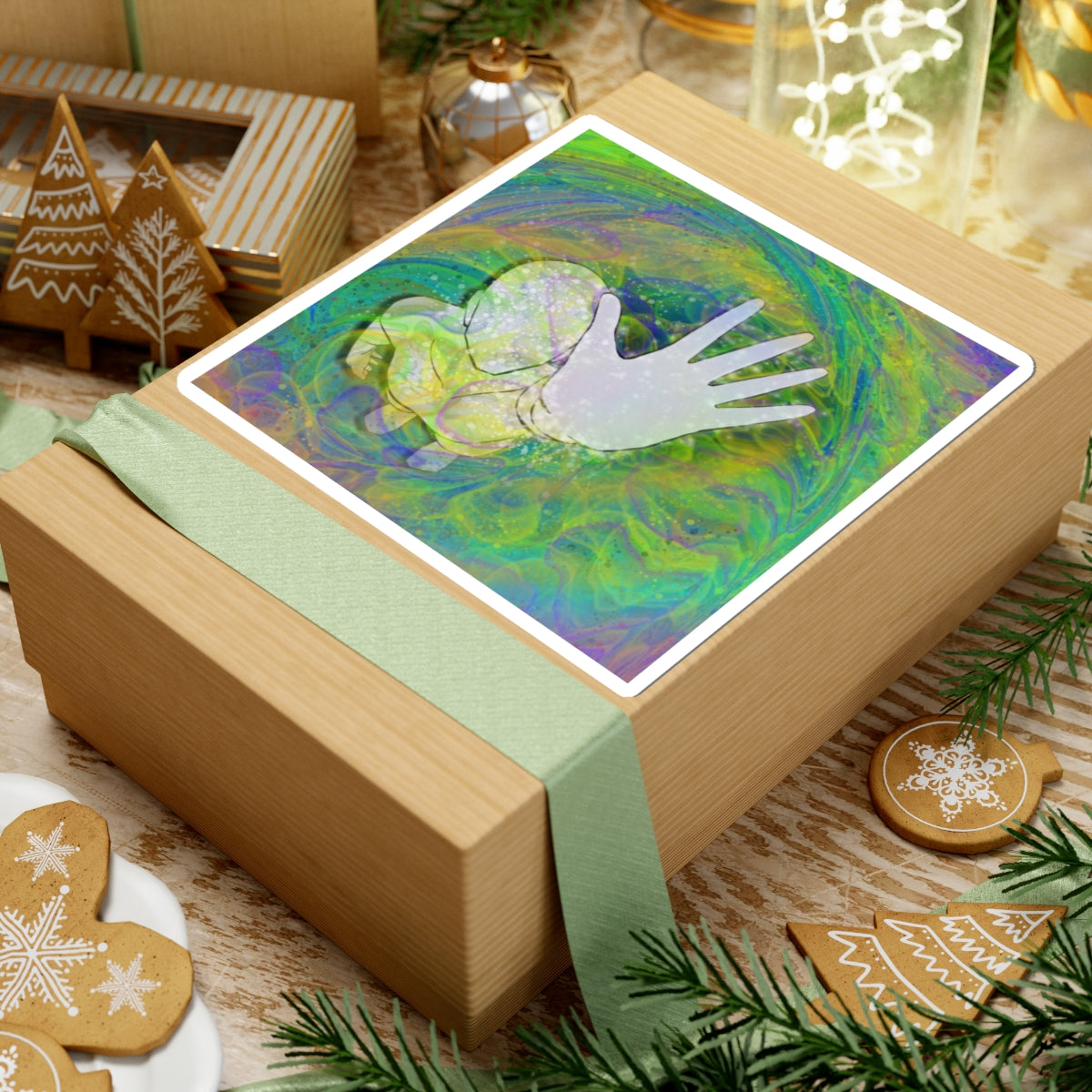 A glossy kiss-cut vinyl sticker that brings a splash of dreamy color to your everyday items. Swirling greens, purples, and golds form a hazy cosmic background, while a translucent silhouette and open hand motif float above like a gentle, otherworldly hello. The printed surface pops with bright, eco-friendly inks and a scratch-resistant gloss that keeps the design vivid on laptops, journals, water bottles (indoor use), and any smooth, flat surface. The sticker applies smoothly without bubbles and comes in white or transparent options and multiple sizes so you can place it wherever it tells your story best.
