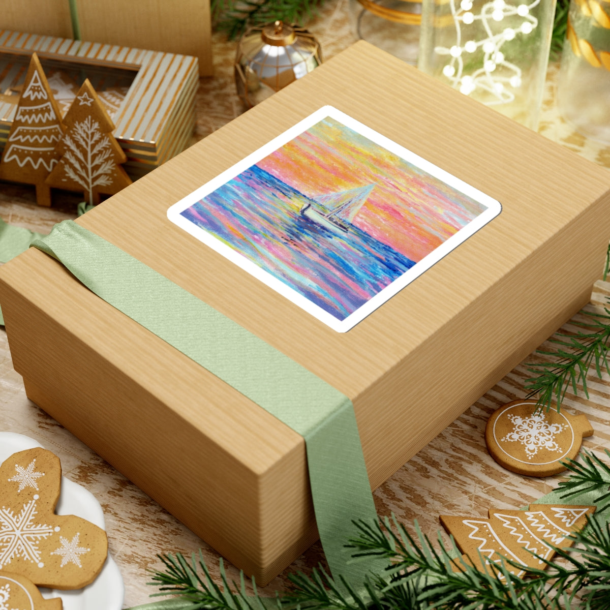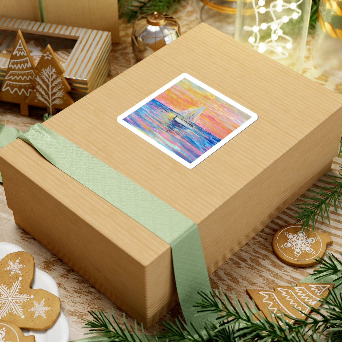 A small square sticker that carries the dreamy hush of a seaside sunset. Soft pastel strokes of pink, orange, and lavender wash across the sky while a lone sailboat drifts on gentle, shimmering water. The glossy finish gives the colors extra pop and a subtle sheen, so it catches light like a real horizon. It adds a calm, creative touch to laptops, journals, water bottles (indoor use), and windows, bringing a moment of coastal stillness to everyday surfaces.