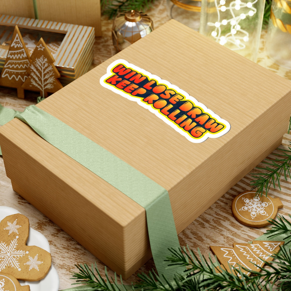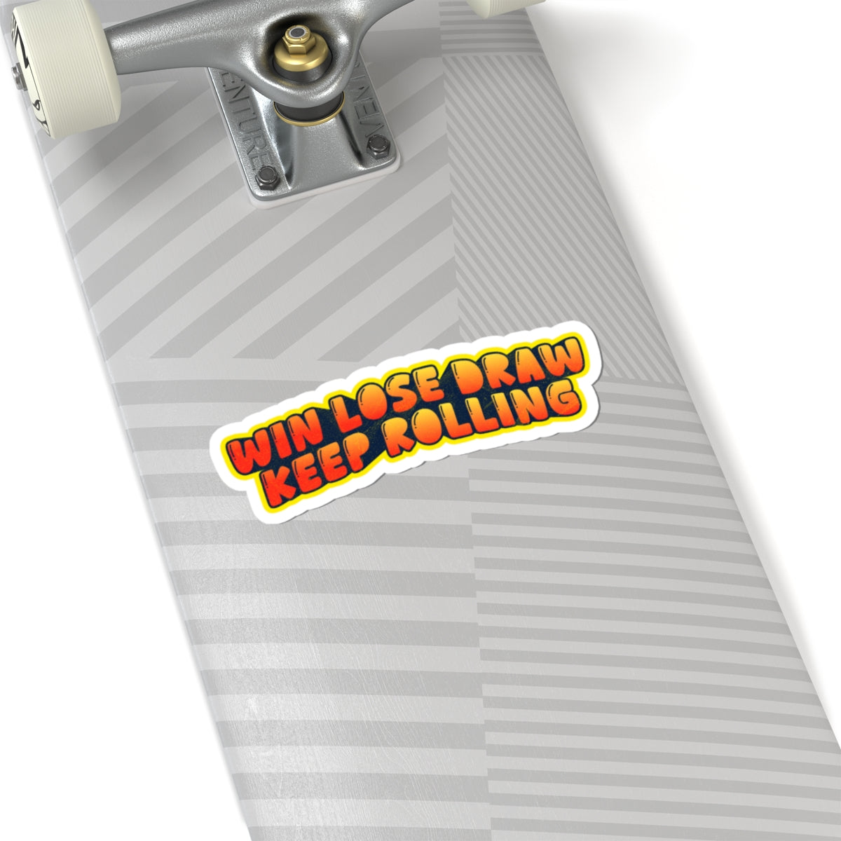 A bold, retro-style kiss-cut sticker that reads “WIN LOSE DRAW KEEP ROLLING” in warm sunset hues. The glossy finish makes the orange-to-red lettering pop against the soft yellow halo, giving a playful, energetic vibe that suits gaming tables, laptops, and notebooks. It’s made from durable vinyl with a strong permanent adhesive for long-lasting indoor use and applies smoothly without bubbles. Small but striking, this sticker becomes a little daily reminder to keep playing and enjoy the process — whether you’re tracking sessions, decorating a case, or tagging your journal.