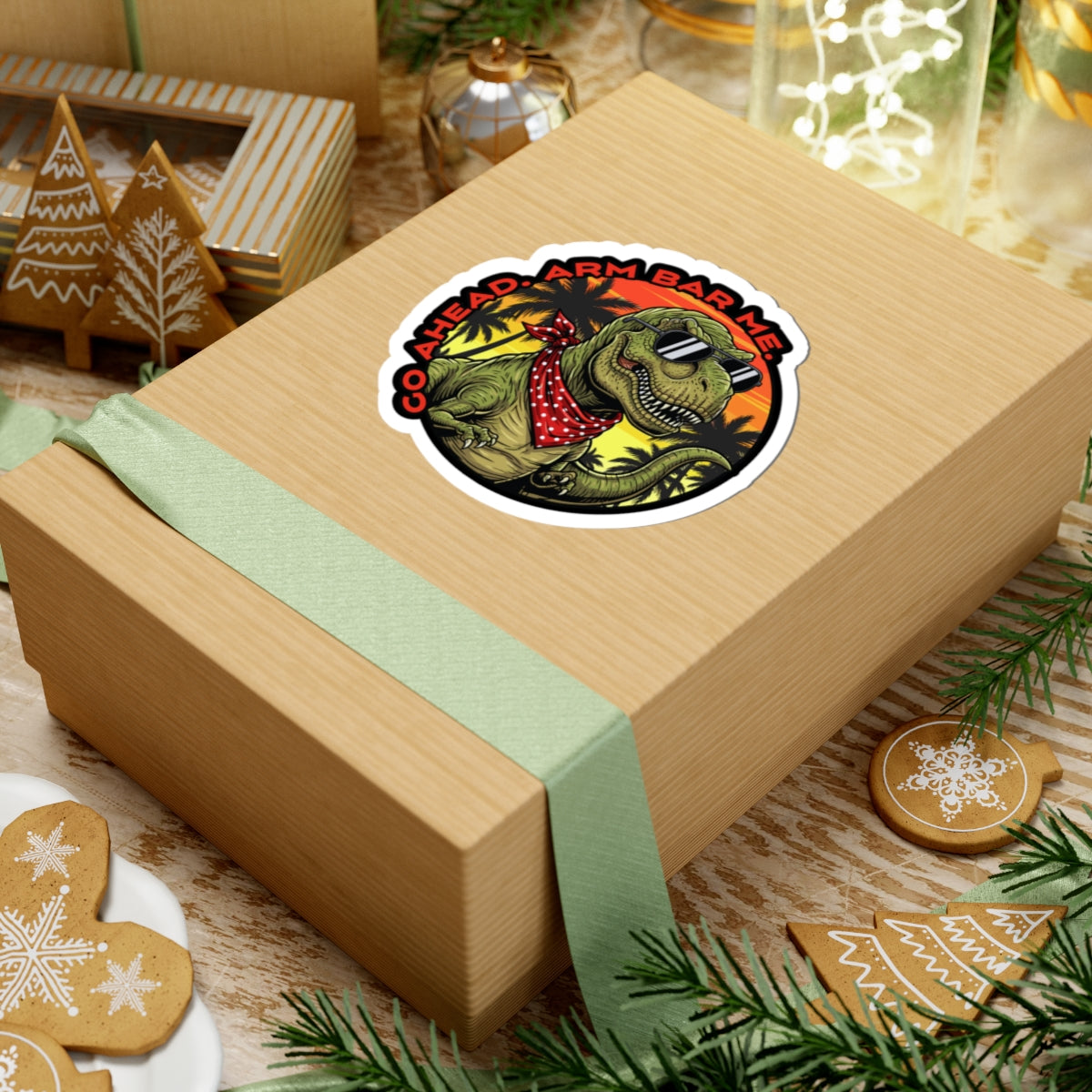 A bold, glossy kiss-cut sticker that brings playful, sun-soaked retro vibes to wherever you place it. The design features a sunglasses-wearing T. rex with a polka-dot bandana set against a warm, tropical sunset and swaying palm silhouettes. Bright eco-solvent inks make the colors pop on durable vinyl, while the scratch-resistant glossy finish keeps the art sharp through everyday wear. Stick it on a laptop, water-resistant journal (avoid constant moisture), skateboard, or window to add a cheeky, vintage-inspired accent that reads both nostalgic and rebellious.